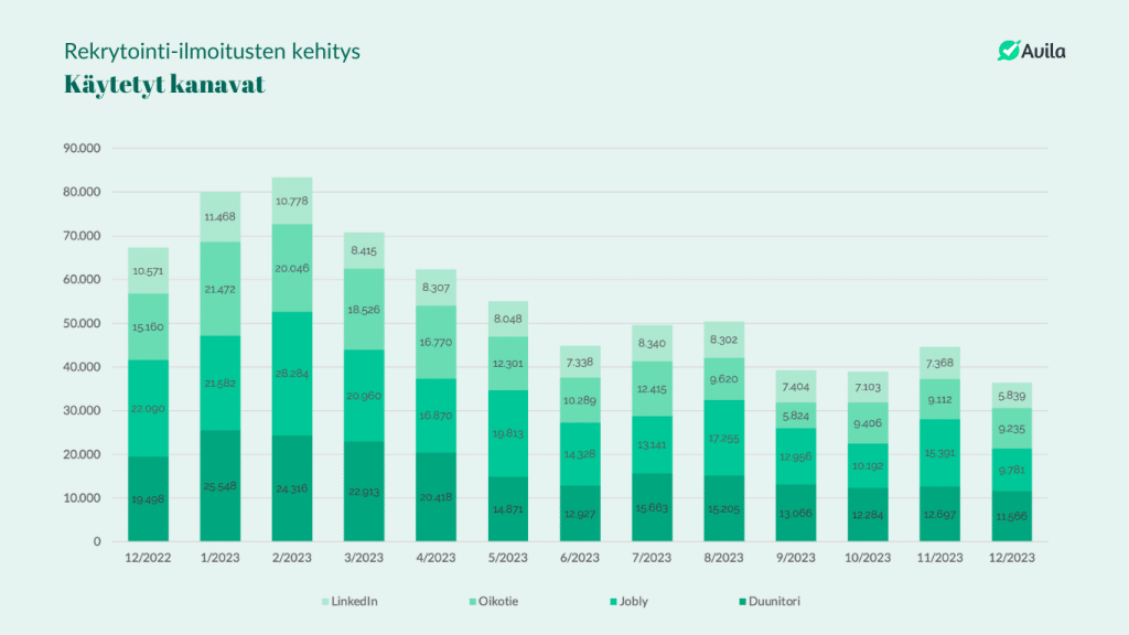 Kuva: Rekrytointi-ilmoitusten kehitys ja käytetyt kanavat (Avilan työmarkkinaraportti, 2023)